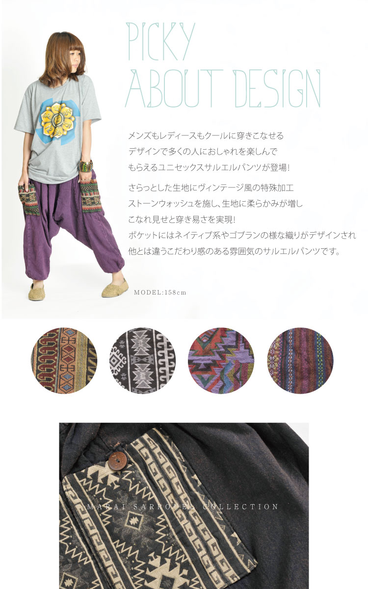 ポケットにはネイティブ系やゴブランの様な織りがデザインされ 他とは違うこだわり感のある雰囲気のサルエルパンツです。