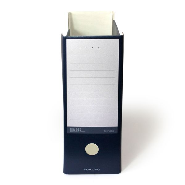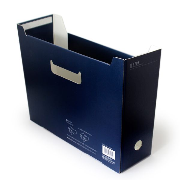 メーカー希望小売価格:418円(税込)ファイルボックス NEOS ネイビー A4F-NELF-DBサイズ A4サイズ 高さ:260×幅:317×背幅:102mm 仕様 フィンガーホール付き(棚からスムーズに取り出しやすいです) 切欠き付き(段付きなので見出しが見えやすいです) 材質 段ボール 特徴 縦置き・横置きの両方で使えるファイルボックスです。